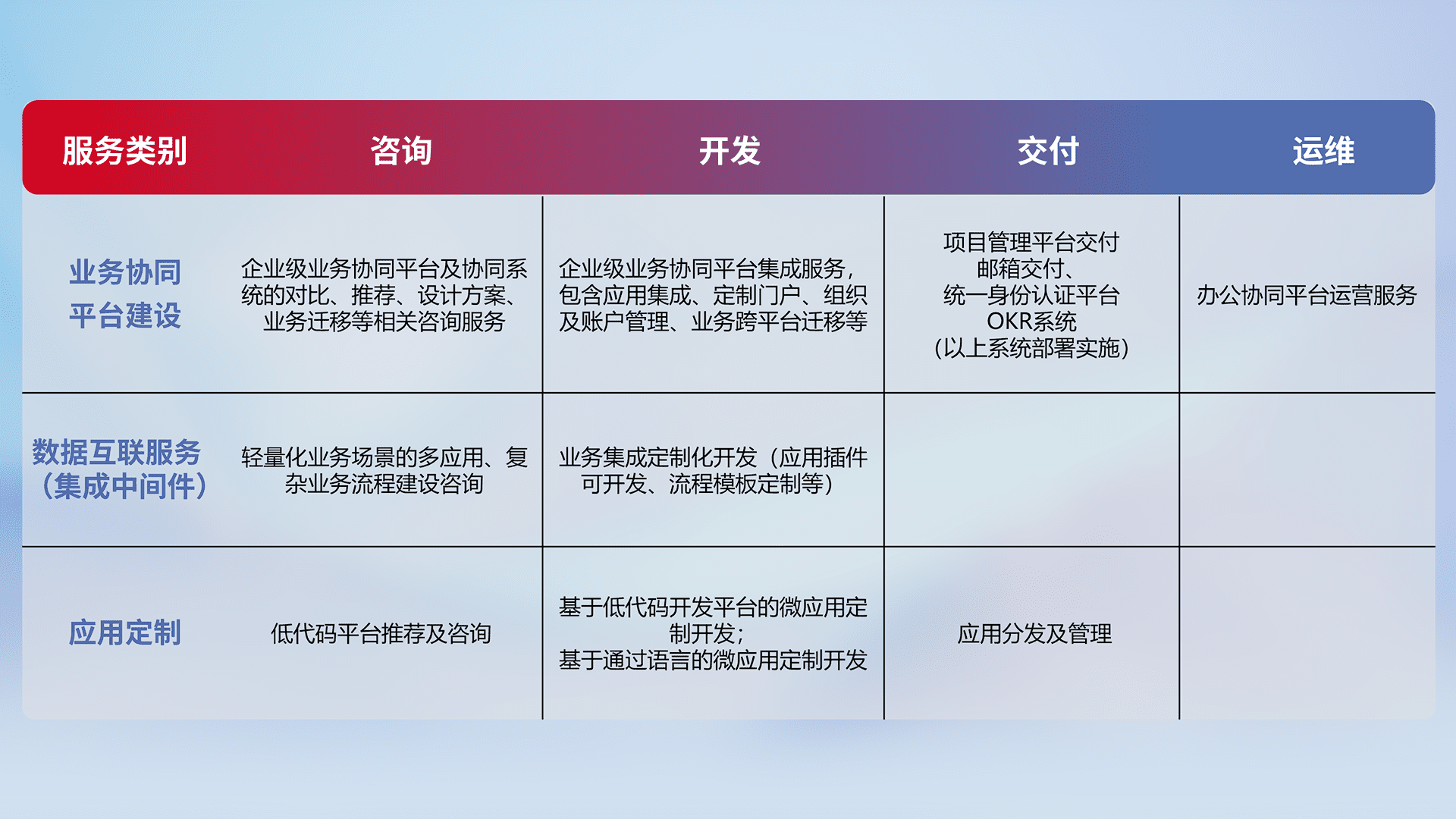 针对钉钉、、、企微、、、、IDaas等平台级产品提供产品的规划、、、、方案、、、交付、、、、定制化开发等服务,,,,实现如统一协同办公、、智能客户服务、、混合会议管理、、智能数据查询、、、等业务场景,,实现数字化转型。。。。