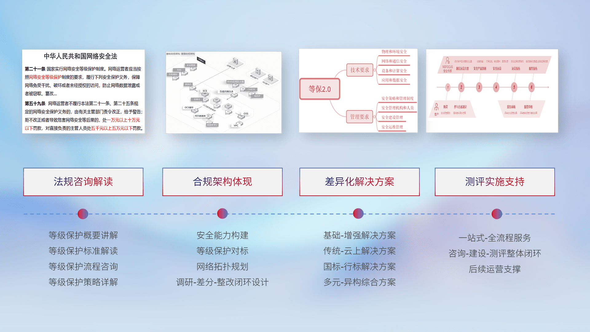通过专业的法律咨询解读、、、合规架构体现、、差异化解决方案、、测试实施支持等服务,,,,为客户量身打造等保合规体系。。