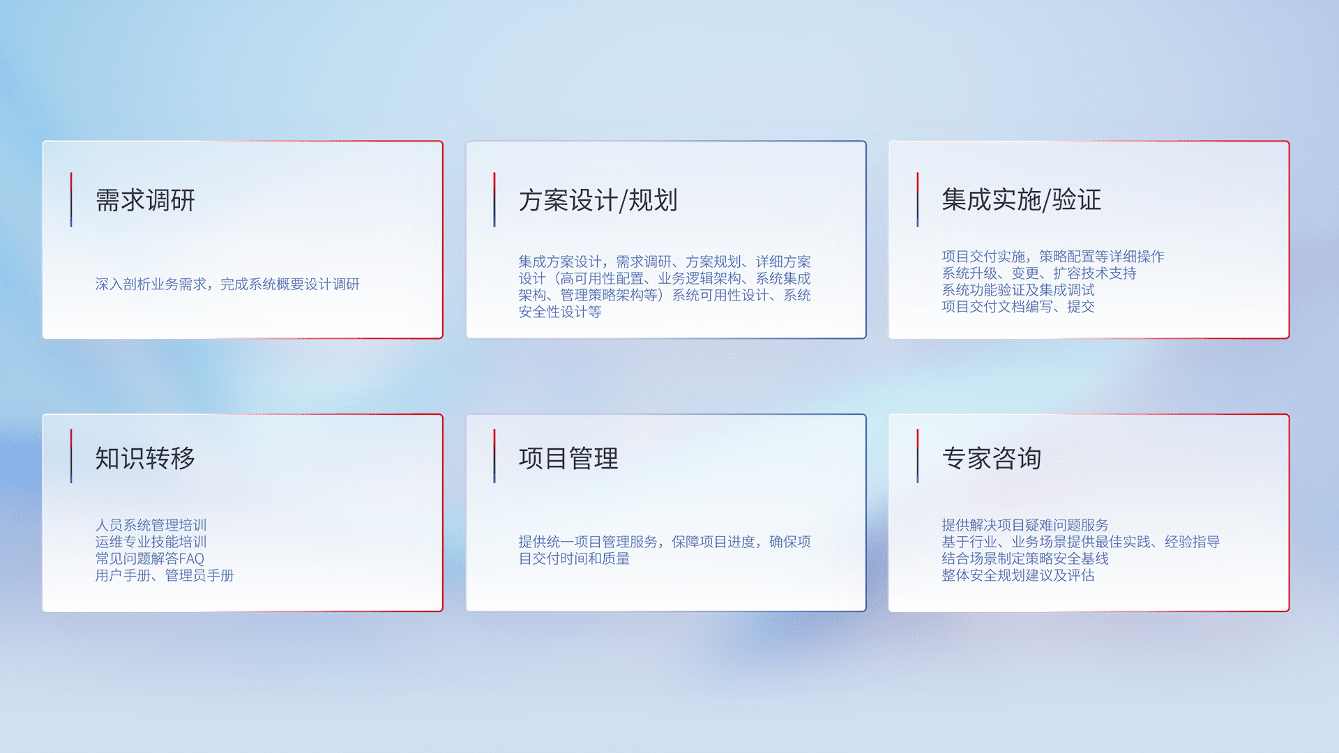 针对客户行业特性,,,,将宏观的安全战略和需求,,通过专业的交付服务,,,,实现项目落地,,,为客户提供标准规范的集成交付服务。。